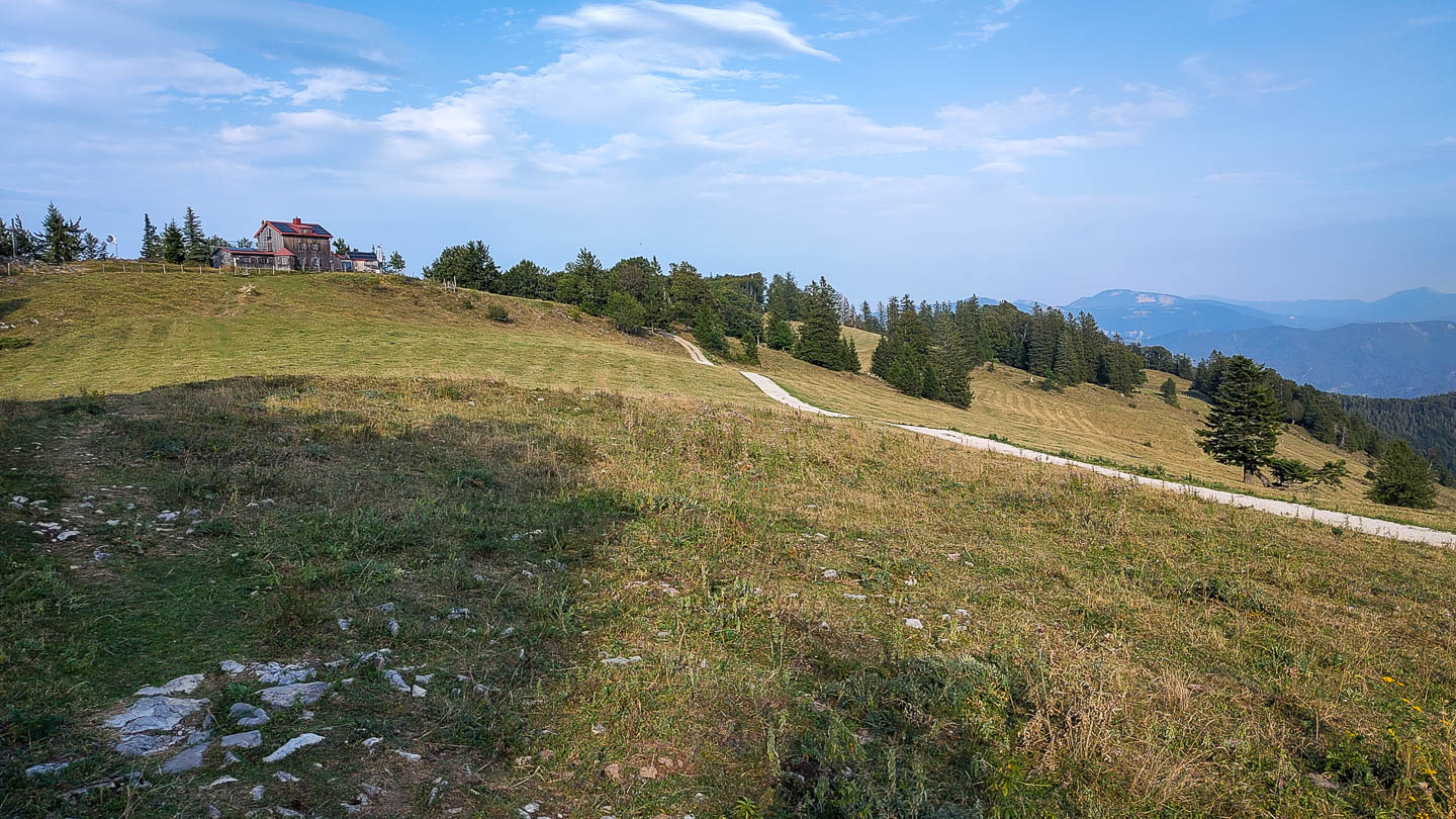 Knapp vor dem Gipfel mündet der bisher unmarkierte Steig in einen markierten Wanderweg. Der Gipfel selbst ist wie gesagt bewaldet und völlig aussichtslos, allerdings gibt es unweit von ihm einen wunderbaren Blickplatz zum Schneeberg. Diesen lassen wir natürlich nicht aus, bevor es weiter zur Einkehr im Naturfreundhaus geht. Nach der Stärkung steigen wir schließlich einfach und dennoch hübsch über den Laubgraben ab, der uns zurück zur Burg Stixenstein bringt.
